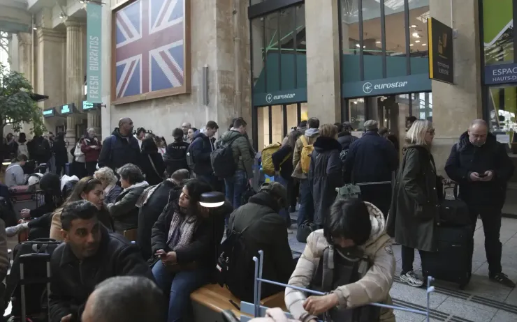 Hành khách chờ tàu Eurostar đến London và tất cả các chuyến tàu hướng đến miền bắc nước Pháp đã dừng lại sau khi phát hiện ra một quả bom chưa nổ có từ Thế chiến II gần đường ray, ngày 7/3/2025. (Ảnh: AP)