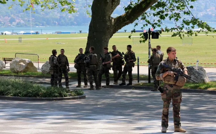 Binh sỹ Pháp bảo vệ hiện trường vụ đâm dao ở Annecy, thuộc dãy núi Alps của Pháp, ngày 8/6. (Ảnh: Reuters)