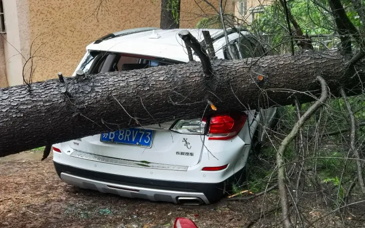 Ô tô bị cây đổ đè bẹp trong bão Bebinca tại Thượng Hải. (Ảnh: AFP)