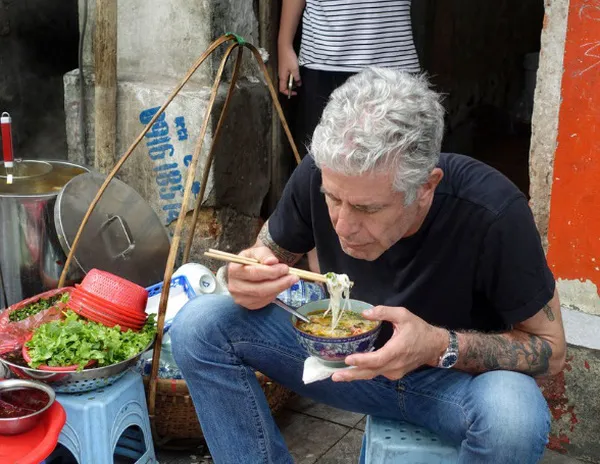 Trước tiên là món bún ốc. Còn gì dân dã hơn hình ảnh một ông Tây bình dị bưng bát bún nóng lên… húp nước dùng “sùm sụp” bên một góc phố vỉa hè? Bourdain đã khởi động cho chặng hành trình ẩm thực ở Hà Nội với món bún ốc theo cách dân dã nhất.