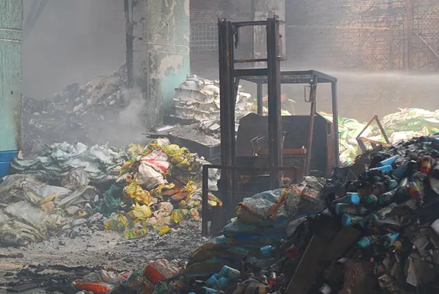 Hiện trường vụ cháy Công ty vật tư nông nghiệp tại Tiền Giang vào rạng sáng 20/9. (Ảnh: Dân trí)