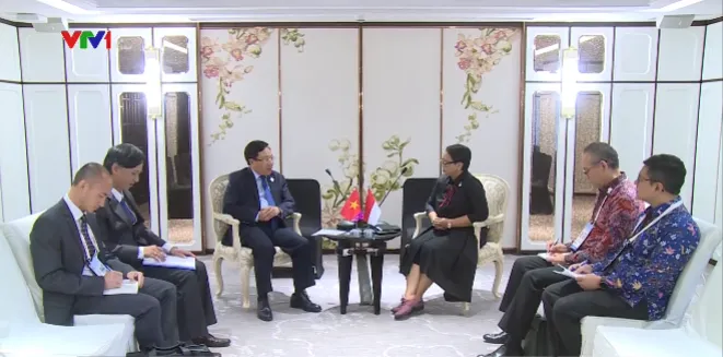 Chiều nay (21/6), tại Thủ đô Bangkok, Thái Lan, trong khuôn khổ dự Hội nghị Bộ trưởng Ngoại giao ASEAN, Phó Thủ tướng, Bộ trưởng Ngoại giao Phạm Bình Minh đã gặp Bộ trưởng Ngoại giao Indonesia Retno Marsudi.