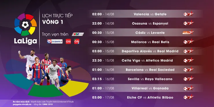 Quý vị khán giả có thể theo dõi các trận đấu của La Liga trên VTVcab, On Sports +, ON và ON+ An tâm mùa dịch, thanh toán cước phí dịch vụ VTVcab trực tuyến qua paygate.vtvcab.vn để nhận nhiều ưu đãi khuyến mãi hấp dẫn. Tổng đài: 1900.1515