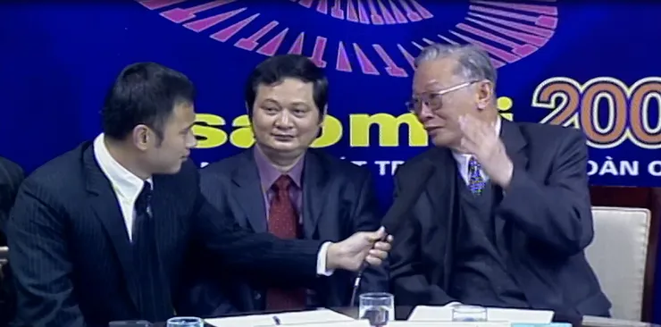 Nhà báo Long Vũ trong một phần dẫn tại Sao Mai 2005. (Ảnh chụp từ phim tư liệu)