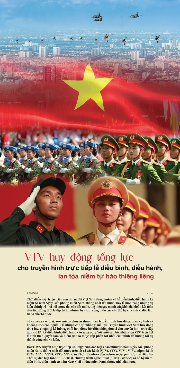 Chiều 26/4, Đài THVN đã tổ chức lễ phát lệnh ra quân phục vụ Lễ diễu binh, diễu hành kỷ niệm 50 năm Ngày Giải phóng miền Nam, thống nhất đất nước, tại TP Hồ Chí Minh. Phát biểu tại buổi lễ, ông Nguyễn Thanh Lâm - Tổng Giám đốc Đài THVN chia sẻ: "Đài THVN không chỉ vinh dự được góp phần làm nên dấu ấn lịch sử cùng với đất nước, mà đây cũng sẽ là dấu ấn lịch sử của Đài THVN trong dịp kỷ niệm 55 năm phát sóng chương trình đầu tiên”. Ông cũng nhấn mạnh, thành công của buổi truyền hình trực tiếp trước hết là sự chỉn chu trong từng khuôn hình, truyền tải những hình ảnh, âm thanh sống động, nhưng mong muốn cao nhất là cảm xúc của khán giả. Người dân không chỉ được chứng kiến qua sóng truyền hình, mà còn như được tham gia trực tiếp vào ngày hội của non sông.