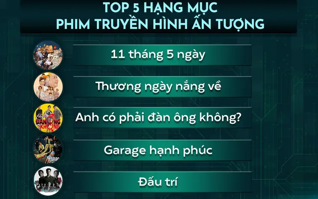 5 đề cử cho hạng mục Phim truyền hình ấn tượng của VTV Awards 2022 có lượt bình chọn trên VTVGo cao nhất tính đến 9/11/2022 và được xếp thứ tự theo bảng chữ cái bao gồm: 11 tháng 5 ngày, Anh có phải đàn ông không?, Đấu trí, Ga-ra hạnh phúc và Thương ngày nắng về.