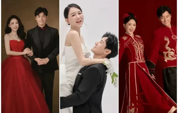 Trần Kiều Ân và chồng chọn 3 bộ trang phục khác nhau, từ truyền thống đến hiện đại. (Ảnh: Weibo)