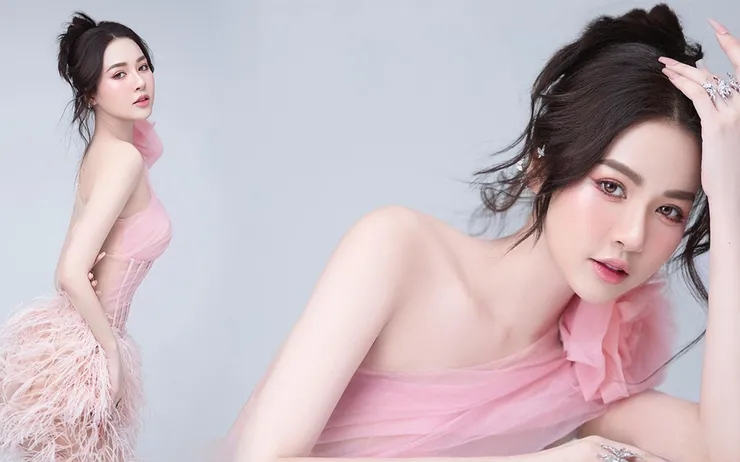Bộ đầm màu hồng tôn lên nét đẹp quyến rũ của tân Hoa khôi Áo dài Việt Nam 2023. Điểm xuyết ở phần chân váy là những sợi lông vũ mềm mại, làm tăng thêm độ lung linh cho set đồ. Lối trang điểm nhẹ nhàng, tự nhiên là điểm cộng giúp nhan sắc Hà Trang tỏa sáng.