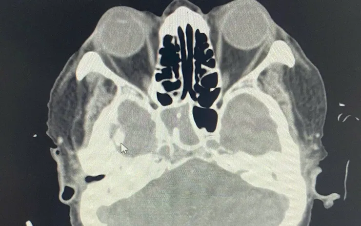 Người bệnh nhập viện trong tình trạng đau đầu dữ dội, kéo dài hàng tuần, không đi lại được. Kết quả chụp cắt lớp vi tính (CT) cho thấy xoang bướm phải mờ đặc, nghi ngờ viêm mủ hoặc nấm xoang. Đây là vị trí nguy hiểm, nằm sâu sát thần kinh thị giác và động mạch cảnh trong, rất dễ gây mù mắt, viêm màng não hoặc nhiễm trùng não nếu không được xử trí sớm.