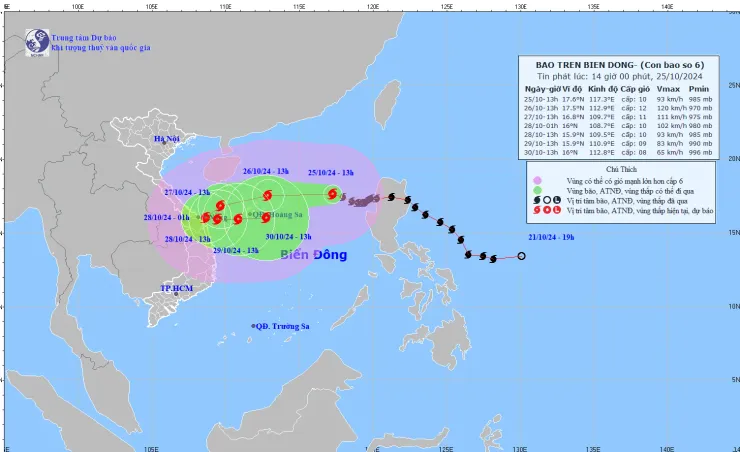 Theo Trung tâm Dự báo Khí tượng thủy văn Quốc gia, hồi 13 giờ ngày 25/10, vị trí tâm bão ở vào khoảng 17,6 độ Vĩ Bắc; 117,3 độ Kinh Đông, trên vùng biển phía Đông của khu vực Bắc Biển Đông, cách quần đảo Hoàng Sa khoảng 560km về phía Đông Đông Bắc. Sức gió mạnh nhất vùng gần tâm bão mạnh cấp 10 (89-102km/h), giật cấp 12. Di chuyển theo hướng Tây Tây Bắc, tốc độ 15-20km/h.