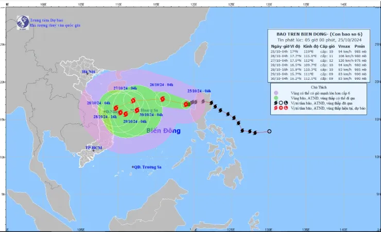 Theo Trung tâm Dự báo Khí tượng Thủy văn Quốc gia, hồi 4 giờ ngày 25/10, vị trí tâm bão số 6 (bão Trami) ở khoảng 17,0 độ Vĩ Bắc; 119,0 độ Kinh Đông, trên vùng biển phía Đông của khu vực Bắc Biển Đông.