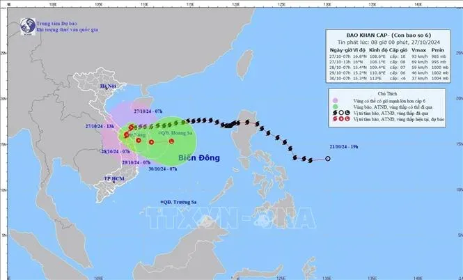 Hướng di chuyển của bão số 6, cập nhật lúc 7 giờ, ngày 27/10. Ảnh: TTXVN phát