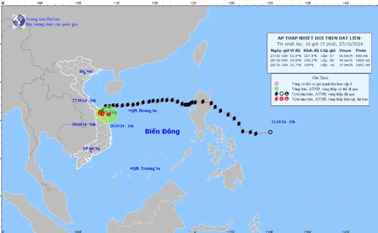 Hồi 16 giờ, vị trí tâm áp thấp nhiệt đới ở vào khoảng 15,9 độ Vĩ Bắc; 107,9 độ Kinh Đông, trên đất liền các tỉnh Thừa Thiên Huế, Quảng Nam - Đà Nẵng. Sức gió mạnh nhất vùng gần tâm áp thấp nhiệt đới mạnh cấp 7 (50 - 61 km/h), giật cấp 9. Di chuyển theo hướng Nam Tây Nam, tốc độ khoảng 5 km/h.