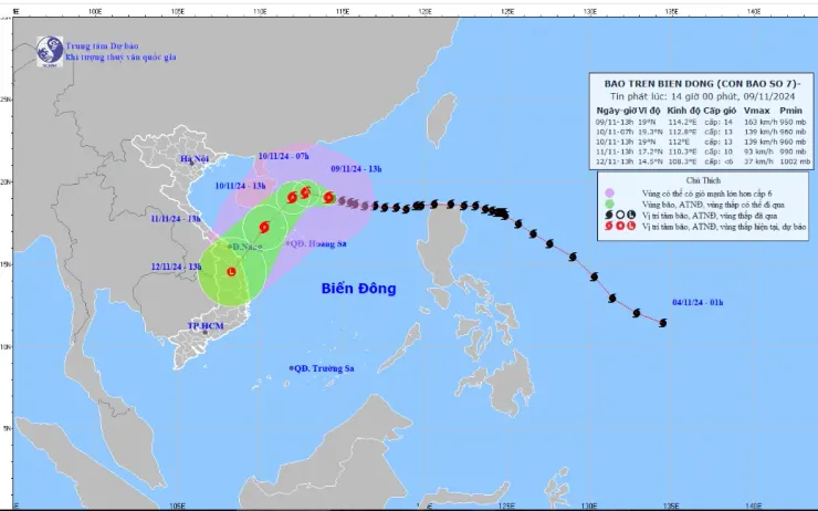Theo Trung tâm Dự báo Khí tượng Thủy văn Quốc gia, hồi 13h ngày 9/11, vị trí tâm bão bão số 7 (Yinxing) ở vào khoảng 19,0 độ Vĩ Bắc; 114,2 độ Kinh Đông, trên khu vực Bắc Biển Đông, cách quần đảo Hoàng Sa khoảng 400 km về phía Đông Bắc.