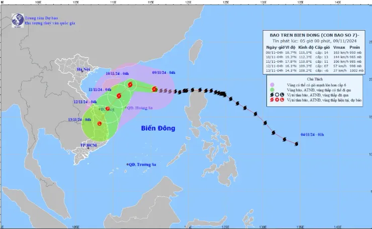 Theo Trung tâm Dự báo Khí tượng Thủy văn Quốc gia, hồi 4 giờ (9/11), vị trí tâm bão ở vào khoảng 18,7 độ Vĩ Bắc; 115,5 độ Kinh Đông, trên vùng biển phía Đông của khu vực Bắc Biển Đông, cách quần đảo Hoàng Sa khoảng 480 km về phía Đông Bắc.