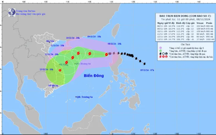 Theo Trung tâm Dự báo Khí tượng Thủy văn Quốc gia, hồi 10 giờ ngày 8/11, vị trí tâm bão ở vào khoảng 18,3 độ Vĩ Bắc; 118,9 độ Kinh Đông, trên vùng biển phía Đông của khu vực Bắc Biển Đông.