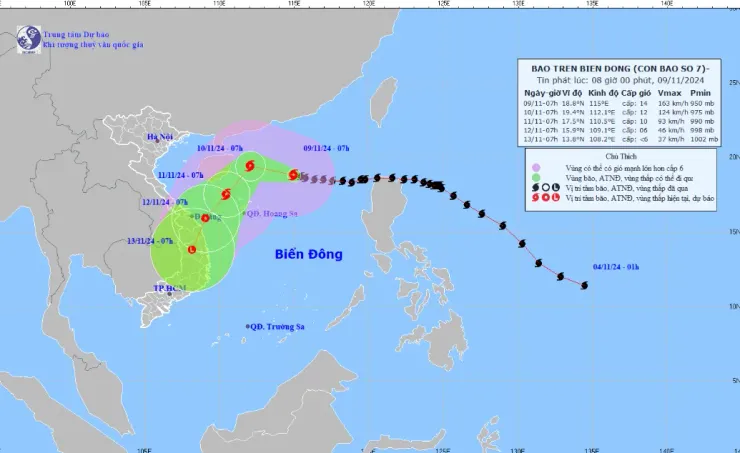 Theo Trung tâm Dự báo Khí tượng Thủy văn Quốc gia, hồi 7h ngày 9/11, vị trí tâm bão số 7 (Yinxing) ở vào khoảng 18,8 độ Vĩ Bắc; 115,0 độ Kinh Đông, trên khu vực Bắc Biển Đông, cách quần đảo Hoàng Sa khoảng 430 km về phía Đông Bắc.
