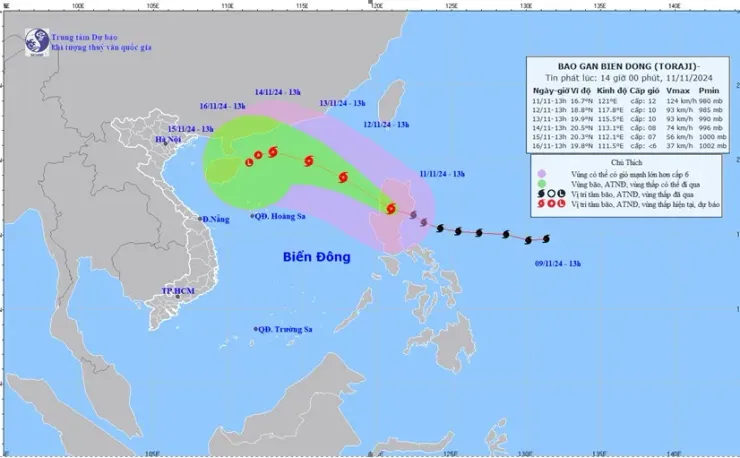 Theo dự báo, tối và đêm nay, bão Toraji sẽ đi vào biển Đông với cường độ khoảng cấp 10 tương đương sức gió 89 - 102 km/h, giật cấp 12.