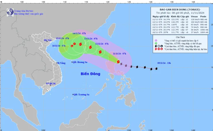 Hồi 7 giờ ngày 11/11, vị trí tâm bão ở vào khoảng 16,3 độ Vĩ Bắc; 122,5 độ Kinh Đông, trên vùng biển phía Đông đảo Luzon (Philippines). Sức gió mạnh nhất vùng gần tâm bão mạnh cấp 12 (118-133km/h), giật cấp 15. Di chuyển theo hướng Tây Tây Bắc, tốc độ khoảng 20km/h.