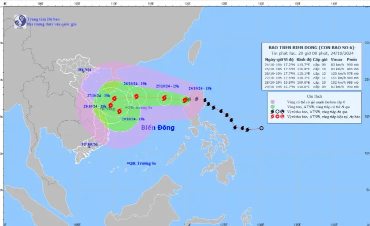 Nhận định về diễn biến bão số 6, Trưởng phòng Dự báo thời tiết, Trung tâm Dự báo Khí tượng Thủy văn Quốc gia Nguyễn Văn Hưởng cho biết, chiều 24/10, bão Trà Mi (tên quốc tế là Trami) đã vượt qua Kinh tuyến 120, đi vào Biển Đông và trở thành bão số 6.