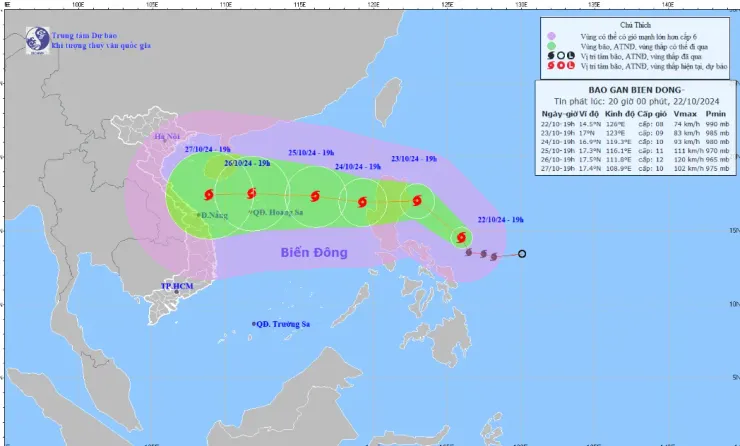 Đến 19h ngày 24/10, vị trí tâm bão ở vào khoảng 16,9 độ vĩ bắc; 119,3 độ kinh đông, trên vùng biển phía Đông khu vực Bắc Biển Đông. Sức gió mạnh nhất vùng gần tâm bão mạnh cấp 10, giật cấp 12. Bão di chuyển theo hướng Tây, tốc độ 15 - 20 km/h, đi vào Biển Đông.