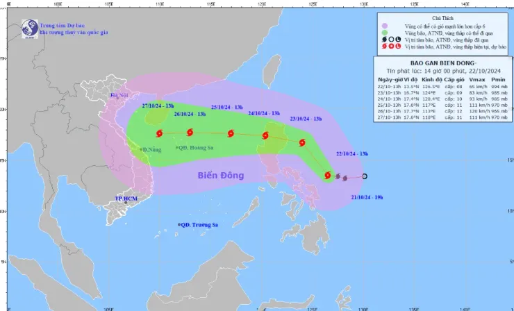 Đến 13h chiều 25/10, tâm bão ở trên vùng biển phía đông khu vực Bắc Biển Đông, cách quần đảo Hoàng Sa 550 km về phía đông đông bắc, sức gió mạnh nhất vùng gần tâm bão mạnh cấp 11, giật cấp 14.