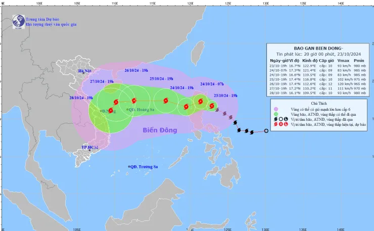 Đến 19 giờ ngày 24/10, bão di chuyển theo hướng Tây Bắc sau có khả năng đổi hướng Tây Tây Nam với tốc độ 15km/h, trên vùng biển phía Đông khu vực Bắc Biển Đông và đi vào Biển Đông. Sức gió mạnh nhất của bão cấp 9, giật cấp 11. Khu vực chịu ảnh hưởng là phía Đông khu vực Bắc Biển Đông; độ rủi ro thiên tai cấp 3.