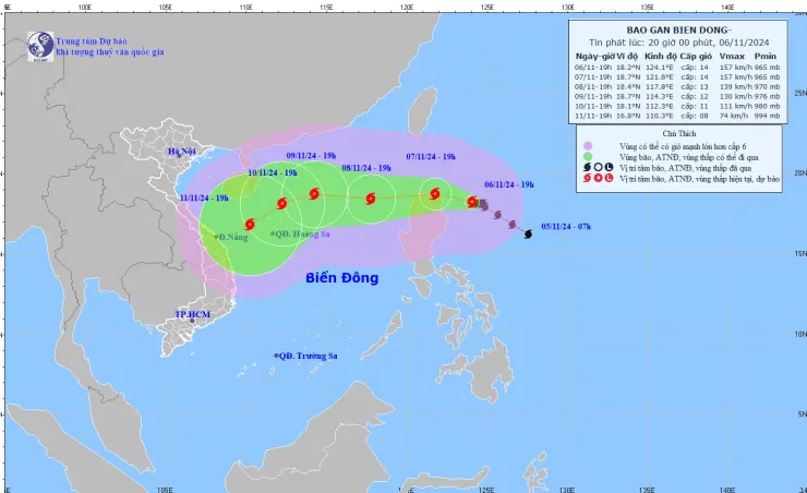 Theo Trung tâm Dự báo khí tượng thủy văn Quốc gia, hồi 19 giờ ngày 6/11, vị trí tâm bão khoảng 18,2 độ Vĩ Bắc; 124,1 độ Kinh Đông, trên vùng biển phía Đông Bắc đảo Luzon (Philippines). Sức gió mạnh nhất vùng gần tâm bão mạnh cấp 14 (150-166km/giờ), giật cấp 17. Di chuyển theo hướng Tây Tây Bắc, tốc độ 5-10km/giờ.