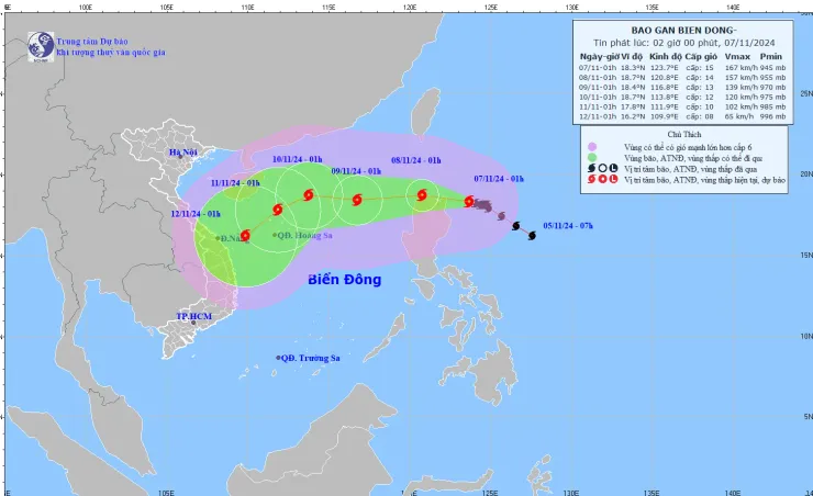 Theo Trung tâm Dự báo khí tượng thủy văn Quốc gia, hồi 1h ngày 07/11, vị trí tâm bão ở vào khoảng 18,3 độ Vĩ Bắc; 123,7 độ Kinh Đông, trên vùng biển phía Đông Bắc đảo Luzon (Philippines). Sức gió mạnh nhất vùng gần tâm bão mạnh cấp 15 (167-183km/h), giật trên cấp 17. Di chuyển theo hướng Tây Tây Bắc, tốc độ 5-10km/h.