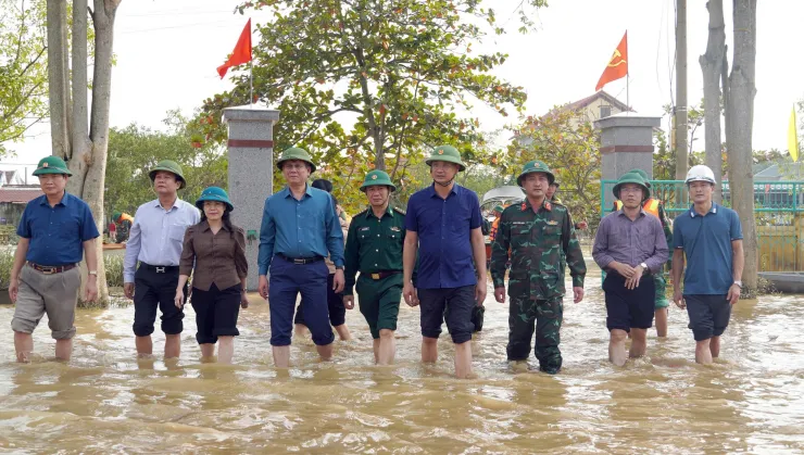Bí thư Tỉnh ủy Quảng Bình Lê Ngọc Quang, Chủ tịch UBND tỉnh Quảng Bình Trần Thắng và đoàn công tác kiểm tra việc khắc phục hậu quả bão lụt tại huyện Lệ Thuỷ