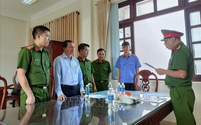 Đọc lệnh bắt tạm giam bị can Nguyễn Xuân Hoan, Phó Chủ tịch UBND huyện Bù Gia Mập. Ảnh: TTXVN