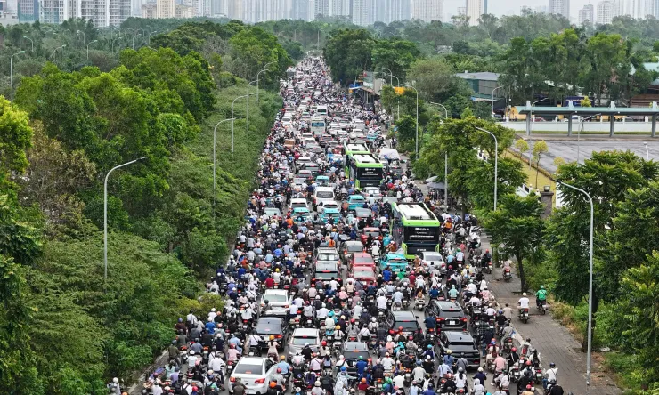 Hình ảnh Đại lộ Thăng Long ùn tắc nghiêm trọng kéo dài hàng chục cây số do phóng viên Thời báo VTV ghi lại:
