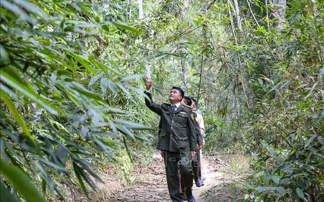 Lực lượng Kiểm lâm cùng người dân tuần tra khu vực rừng nguy cơ xảy ra cháy rừng cao. Ảnh: Xuân Tư/TTXVN