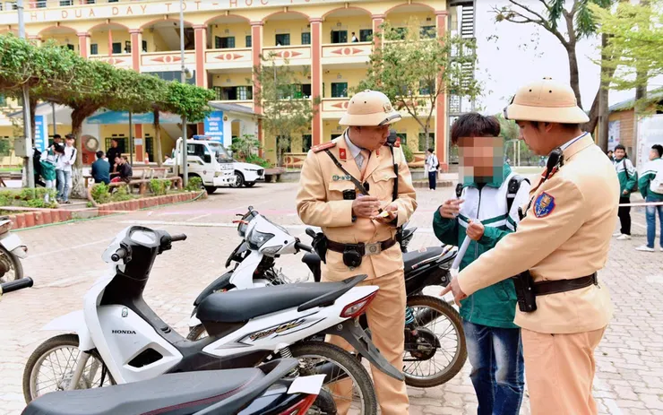 CSGT đã phối hợp với Ban giám hiệu nhà trường, mời chủ xe và phụ huynh học sinh liên quan đến làm việc. Các vi phạm chủ yếu gồm điều khiển xe mô tô không đội mũ bảo hiểm, không có gương chiếu hậu, không gắn biển kiểm soát và học sinh từ đủ 16 đến dưới 18 tuổi điều khiển xe mô tô trên 50cm³.