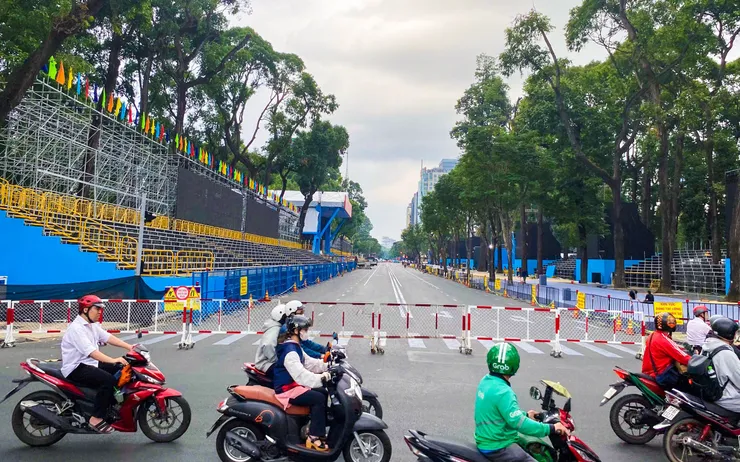 Sau nửa tháng thi công khẩn trương, khán đài và sân khấu trên trục đường Lê Duẩn (Quận 1), đoạn gần Hội trường Thống Nhất đã sắp hoàn tất.