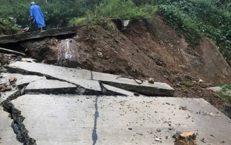 Tuyến đường thôn 2, xã Trà Dơn bị sạt lở, bê tông vỡ vụn. (Ảnh: VOV)