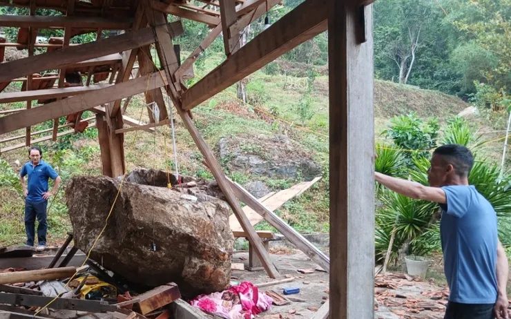 Tảng đá to từ trên cao rơi xuống làm sập nhà người dân. (Ảnh: VOV)