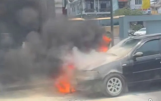 Ngọn lửa tạo ra vụ cháy được cho là bắt nguồn từ khu vực capo ô tô, sau đó bùng phát mạnh ra phía trước thân xe, tạo cột khói đen lớn bốc lên trời.