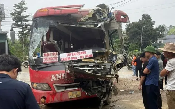 Vụ tai nạn giữa xe khách và xe rơ-moóc trên quốc lộ 2 đoạn qua tỉnh Tuyên Quang ngày 6/4. Ảnh: TTXVN