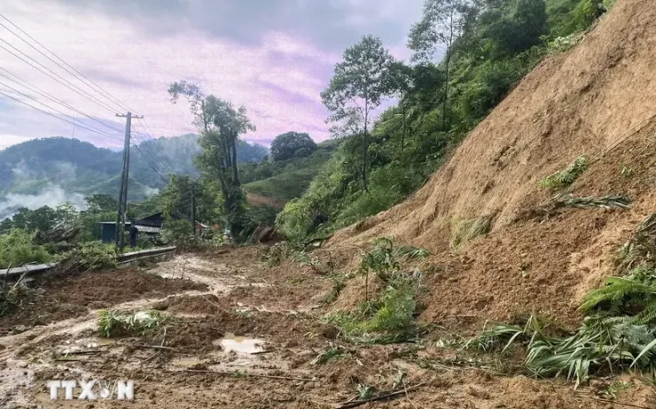 Sạt taluy dương đoạn Km 56+260, Quốc lộ 15C. (Ảnh: TTXVN phát)
