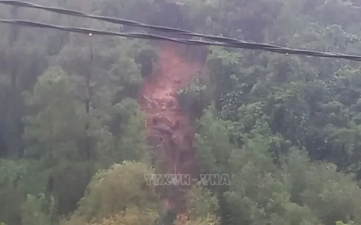 Hiện trường khu vực sạt lở ở núi Phú Gia, xã Lộc Tiến, huyện Phú Lộc. Ảnh: TTXVN phát