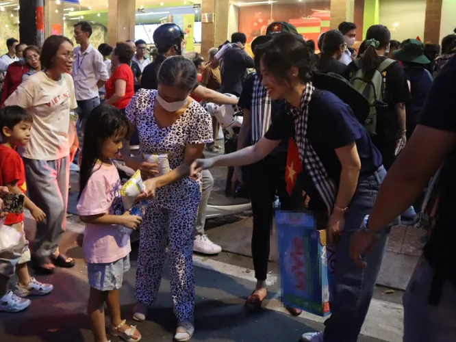 Cầm phần bánh trên tay, em Phạm Anh Khoa (quận Bình Thạnh) tự hào: “Được nhận quà em rất vui và cảm thấy lòng yêu nước của mình dâng trào. Qua đây em học hỏi được rằng chúng ta phải đoàn kết dân tộc và yêu thương, giúp đỡ lẫn nhau”.