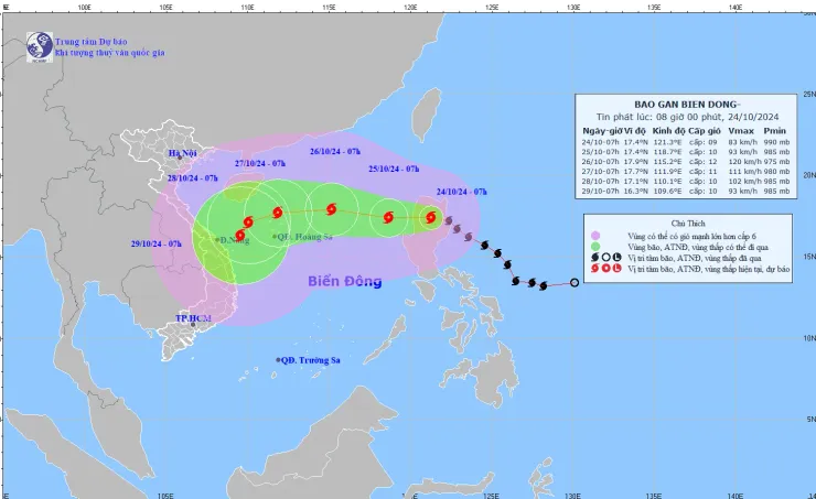 Theo Trung tâm Dự báo Khí tượng thủy văn Quốc gia, hồi 7 giờ ngày 24/10, cơn bão Trami (tiếng Việt là Trà Mi), có vị trí tâm ở vào khoảng 17,4 độ Vĩ Bắc; 121,3 độ Kinh Đông, trên đất liền phía Bắc đảo Luzon (Philippines). Sức gió mạnh nhất vùng gần tâm bão mạnh cấp 9 (75-88km/h), giật cấp 11. Di chuyển theo hướng Tây Tây Bắc, tốc độ 15-20km/h.