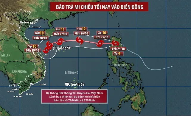 Sáng ngày 24/10, bão Trà Mi đã đi vào đảo Lu Dông của Philippin với cường độ cấp 9, giật cấp 11. Dự báo khoảng chiều tối 24/10 bão sẽ đi vào Biển Đông, trở thành cơn bão số 6.