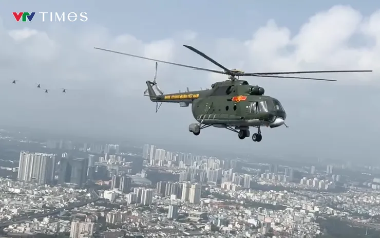 Biên đội trực thăng, Yak-130 và Su-30MK2 trên bầu trời TP Hồ Chí Minh.