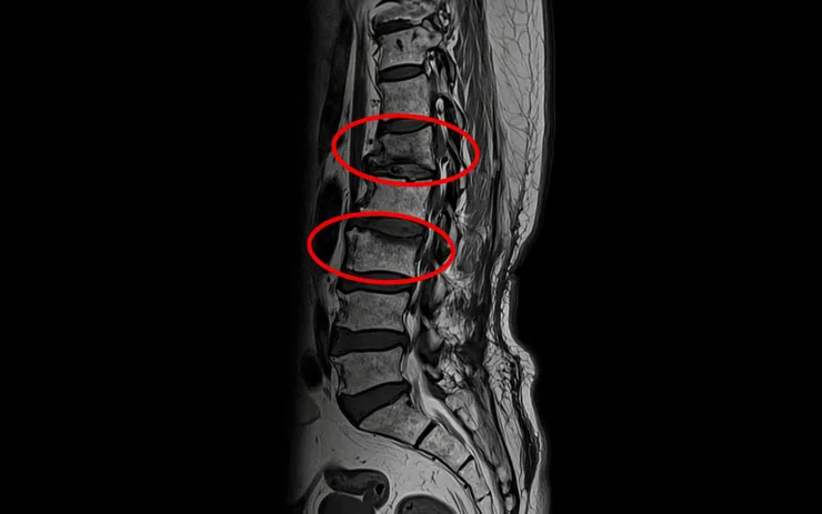 Quyết định đến Bệnh viện Đa khoa Hồng Ngọc thăm khám, kết quả chụp phim MRI cột sống và xét nghiệm cận lâm sàng ghi nhận bệnh nhân bị: xẹp cùng lúc 2 đốt sống do loãng xương nặng, hội chứng Cushing (do dùng corticoid), tăng huyết áp, rối loạn lipid máu, thiếu vitamin D.