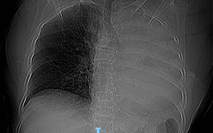 Ngay sau đó, người bệnh được chỉ định chụp CT ngực. Kết quả cho thấy xẹp hoàn toàn phổi trái do khối nằm trong lòng phế quản gốc trái, ban đầu đặt ra nghi vấn u phế quản hoặc dị vật đường thở. Với diễn tiến khởi phát đột ngột, các bác sĩ nghĩ nhiều đến khả năng dị vật và nhanh chóng hội chẩn chuyên môn.
